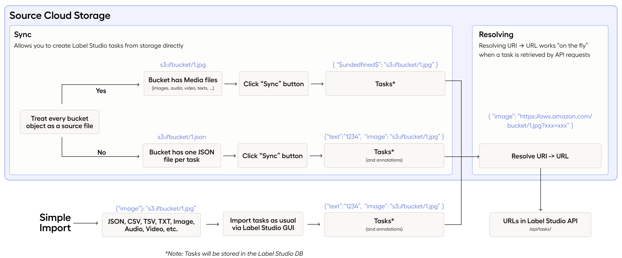- Sync - when Label Studio scans your storage and imports tasks from it.