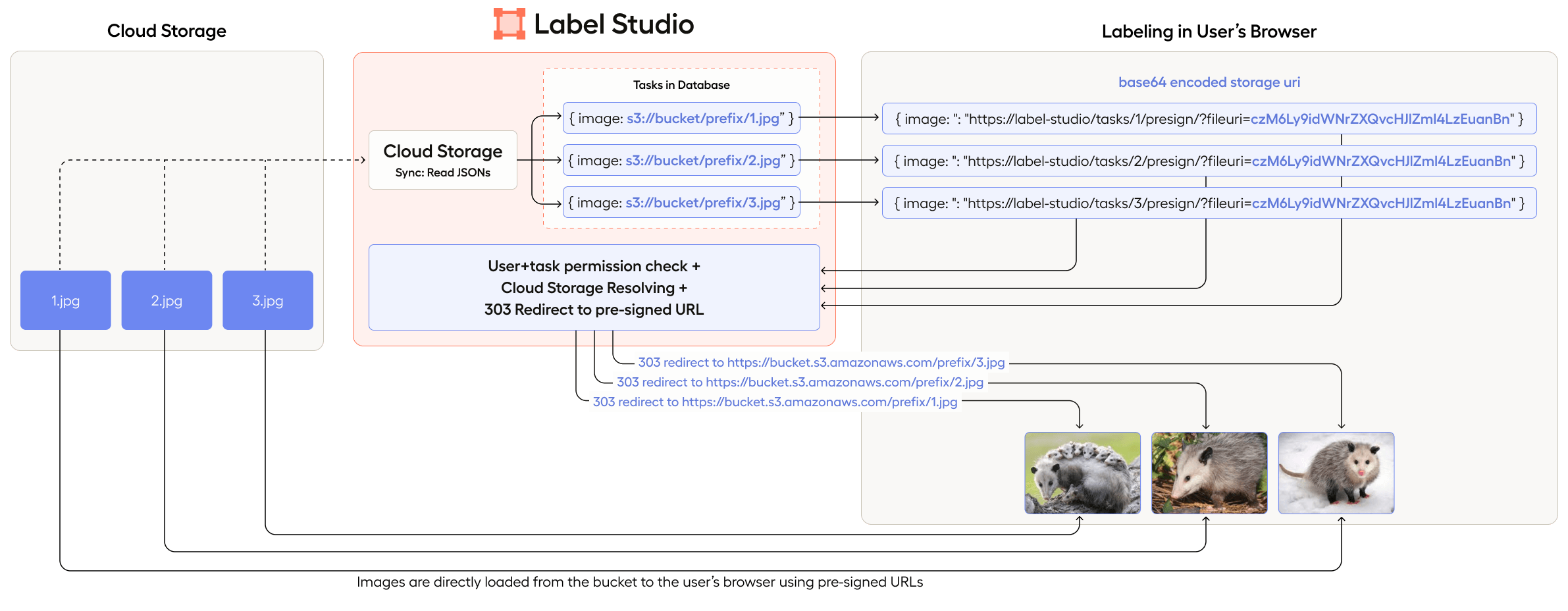 Task data synced from cloud storage is not stored in Label Studio. Instead, the data is accessed using presigned URLs. You can also secure access to cloud storage using VPC and IP restrictions for your storage. For details, see Secure access to cloud storages.